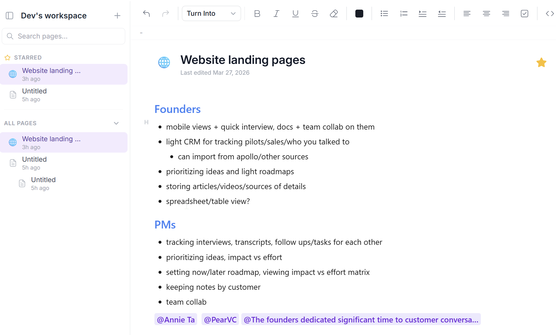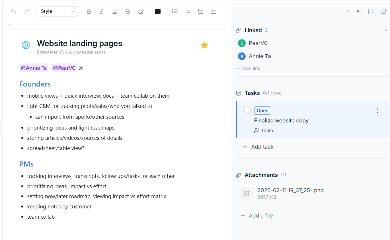 Notes, prep, and brainstorming docs that don't drift away as you sprint ahead.